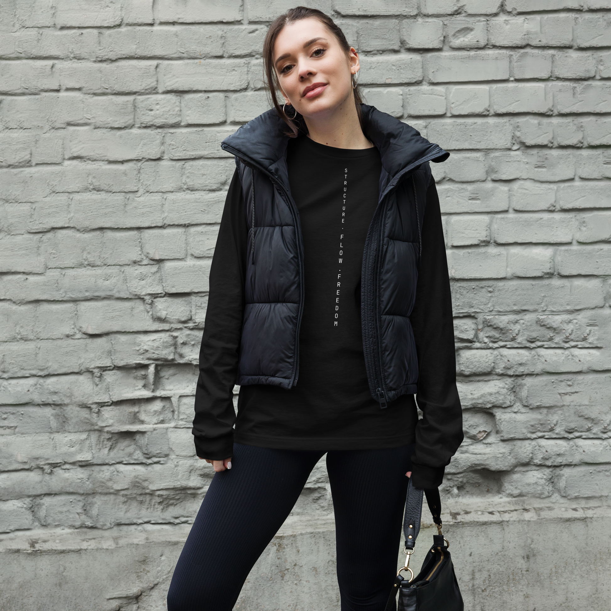 Le mantra vertical STRUCTURE.FLOW.FREEDOM suit la ligne centrale du corps, renforçant posture et présence — parce que le mouvement naît de l’alignement, pas de l’apparence.